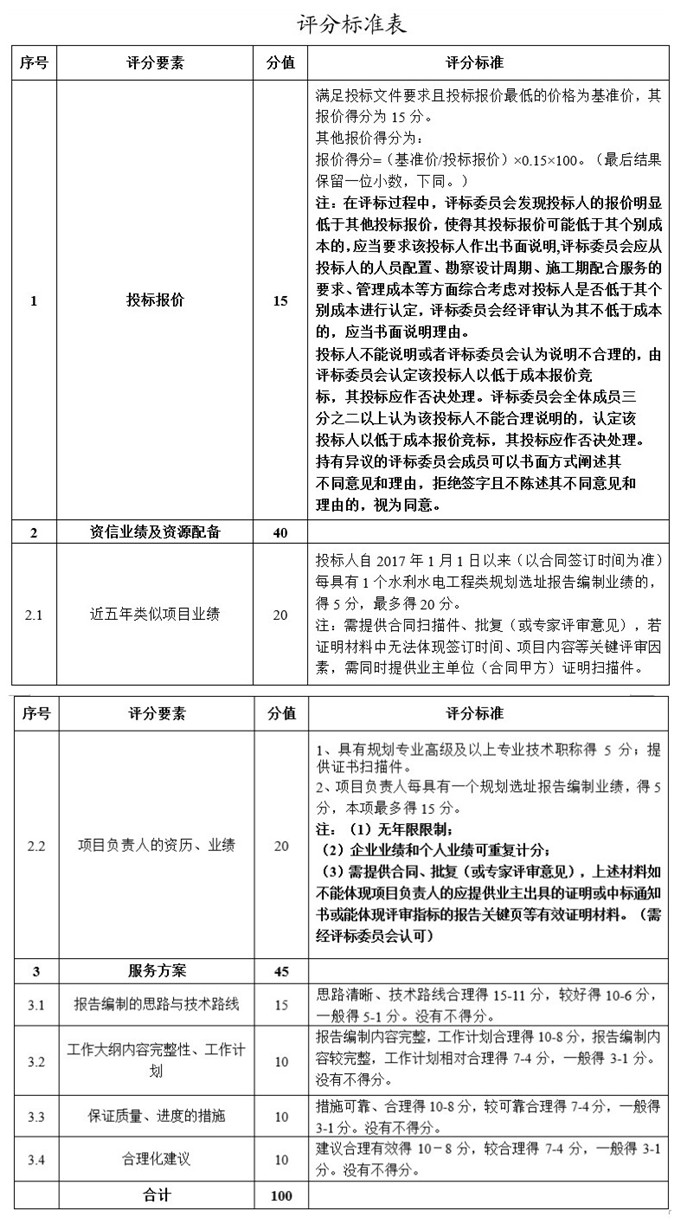 本項目在供應(yīng)商滿足資格要求的前提下依據(jù)業(yè)績、資信、報價等方面進行綜合評選,詳見評分標(biāo)準(zhǔn)表。本項目最高限價為97.5萬元。
