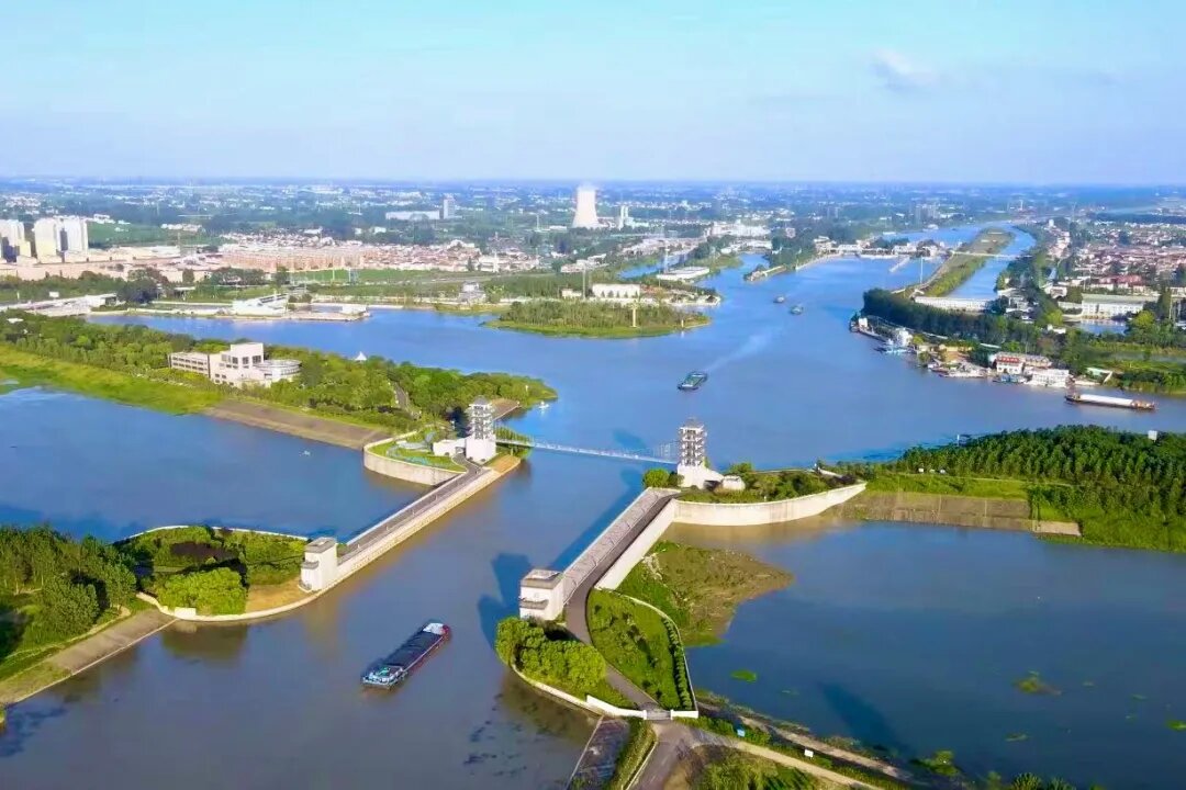 淮河入海水道近期工程西起洪澤湖二河閘,與蘇北灌溉總渠并行,東至扁擔(dān)港入黃海,全長(zhǎng)163.5千米,設(shè)計(jì)行洪流量2270立方米每秒。淮安樞紐工程是淮河入海水道近期工程的第二級(jí)控制工程,在入海水道與京杭大運(yùn)河交匯處,是一座集泄洪、調(diào)水、排澇、航運(yùn)等多種功能于一體的大(1)型工程,其主要作用是實(shí)現(xiàn)入海水道與京杭運(yùn)河的交叉,維持京杭運(yùn)河水路航運(yùn)和南水北調(diào)輸水,滿足入海水道泄洪及渠北運(yùn)西地區(qū)排澇要求。樞紐主要建筑物有入海水道穿京杭運(yùn)河立交地涵、古鹽河與清安河穿堤涵洞、渠北閘和入海水道北堤跨淮揚(yáng)公路立交旱閘等,是亞洲同類工程規(guī)模最大且極具特色的“上槽下洞”的水上立交工程。