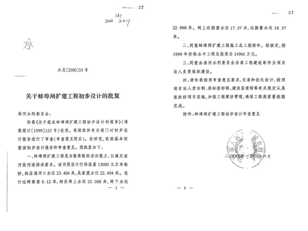 2000年1月26日,水利部以水總〔2000〕33號文正式批準了蚌埠閘擴建工程初步設計,批復概算總投資為14966萬元。2000年11月23日,蚌埠閘擴建工程主體工程開工,歷經三年的緊張施工,于2003年11月順利通過竣工驗收。